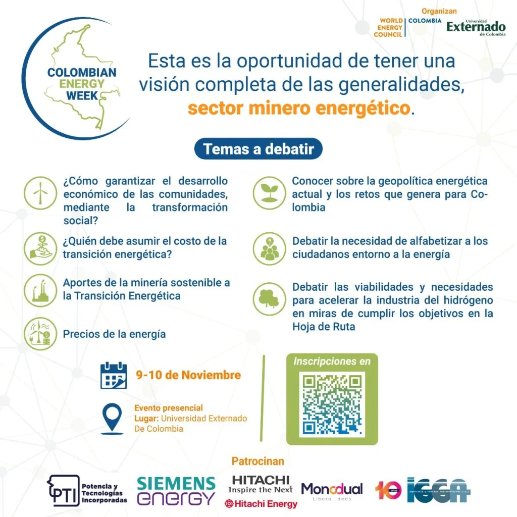 En el marco de los 100 años del World Energy Council, el Consejo Mundial de Energía Colombia lanza la iniciativa Colombian Energy Week, que busca crear un espacio de discusión, aprendizaje y de oportunidades de nuevos modelos de negocio para todos los asistentes del sector energético, en donde se esperan empresarios, directivos, profesionales del sector, estudiantes de posgrado y pregrado, entes gubernamentales, start-ups, entre muchos otros actores más del sector.